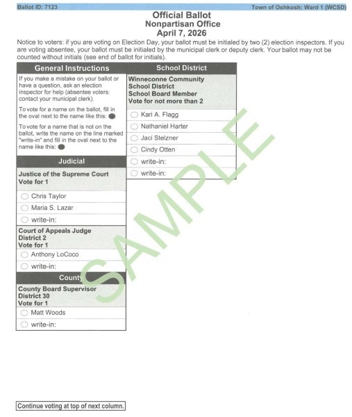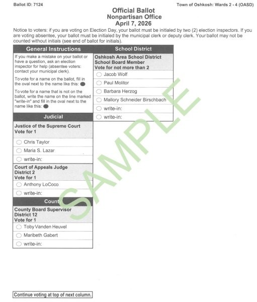There are (3) three ballot styles for this election in the Town of Oshkosh. Ballot samples to view are near the bottom of this page.
